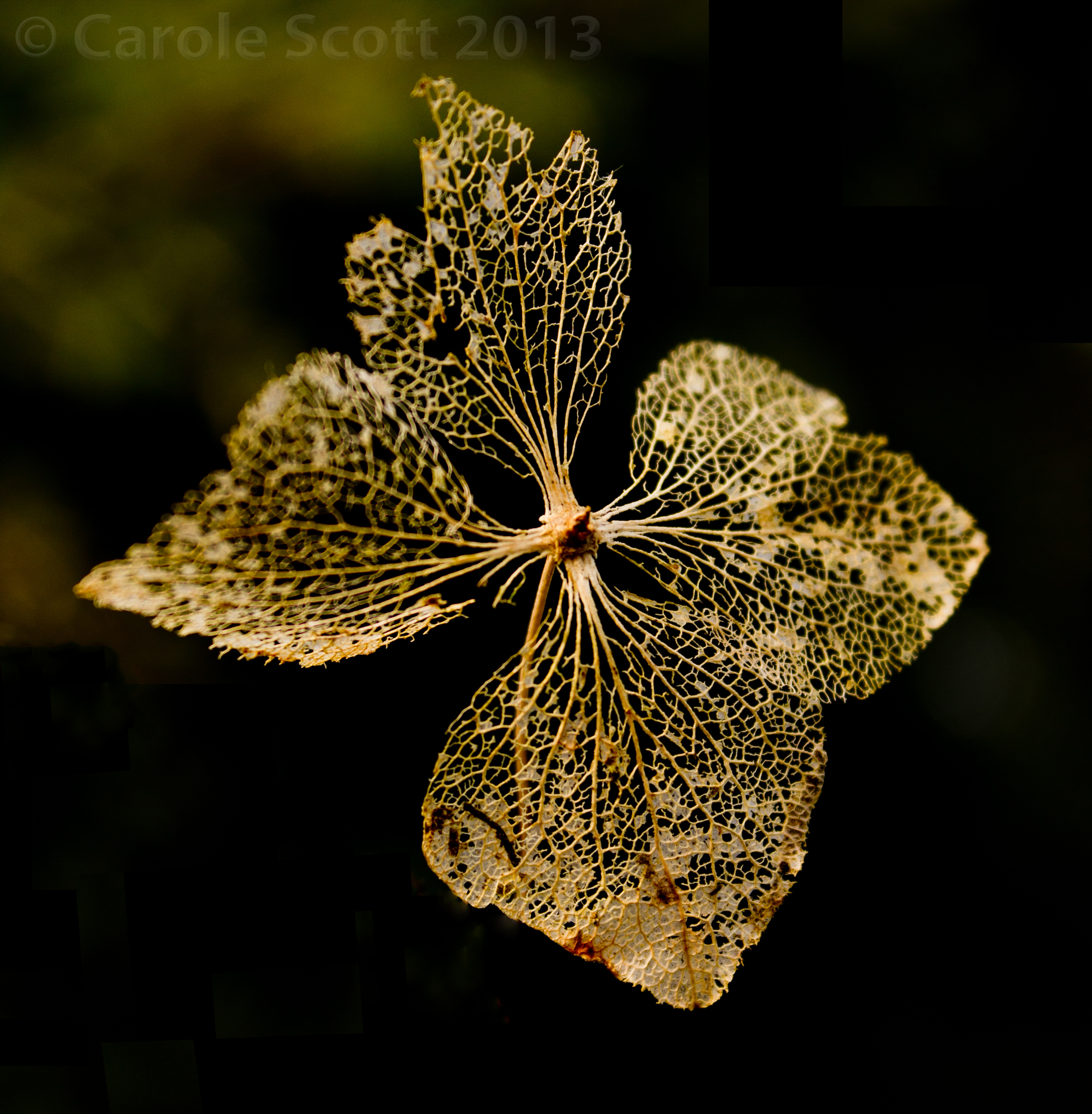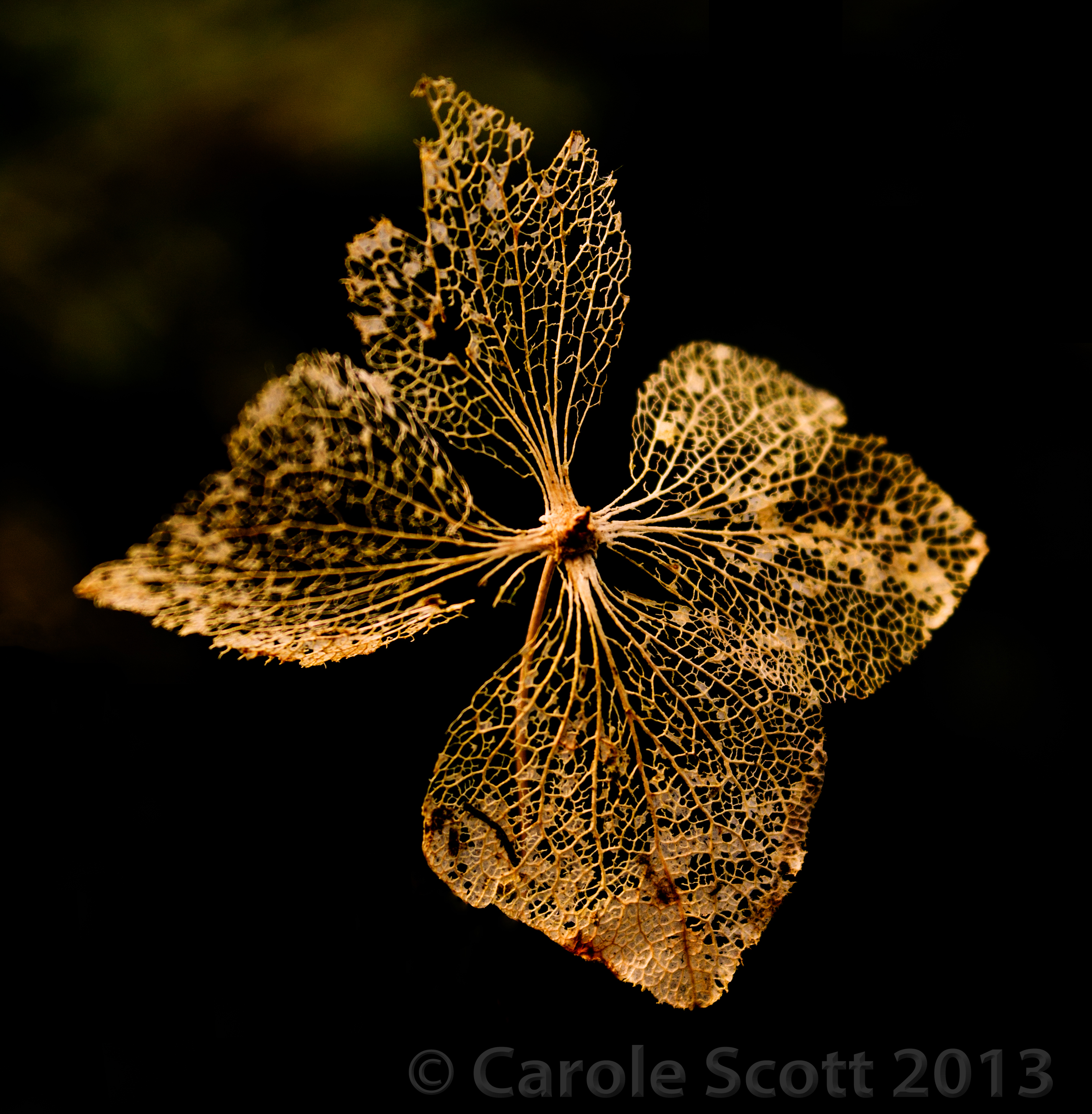 There was work in photoshop – I blurred out the background so that the delicate tracery of veins could be more visible. I played with black and white/sepia but in the end a reduced hue and a darkened background as well as the blurring really worked.