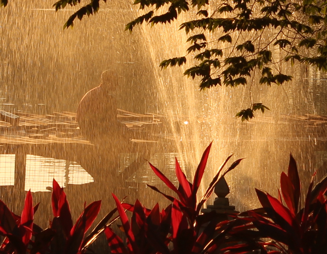 So here is a teaser for my first photography post that will come tonight. On our first day in Yangon (Rangoon), we went to a public park to see the royal barge and for a view of the Shwedegon Pagoda. As the group walked back toward the bus, I caught a glimpse of workers on a jetty, screened behind a sprinkler. This quickly captured shot became my favourite of Yangon.